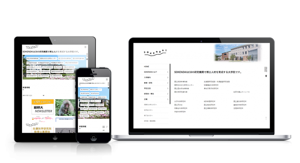 総研大の新サイトはレスポンシブウェブデザインを採用。新しいロゴデザインに合わせ、全体をモノトーンの色調でまとめ、できるだけ白の配分を多くとった2カラム仕様にしました。
